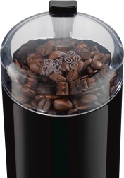 Capacul transparent permite controlul măcinării, iar capacitatea de până la 75 g de boabe este ideală pentru mai multe cești odată.