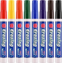 Setul oferă opt culori intense pentru organizarea clară a informațiilor, marcaje creative și prezentări vizual atractive. Vârfurile rezistente nu se deformează și oferă o trasă curată, fără pete, în timp ce cerneala poate fi ștearsă ușor cu o cârpă uscată sau cu o racletă.