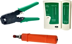 - Tester de cabluri RJ45/RJ11, clește de sertizat 4/6/8P, instrument LSA (impact tool), stripper, tăietoare, șurubelnițe cu cap plat și în cruce, 10× conector RJ45, husă de transport, manual
