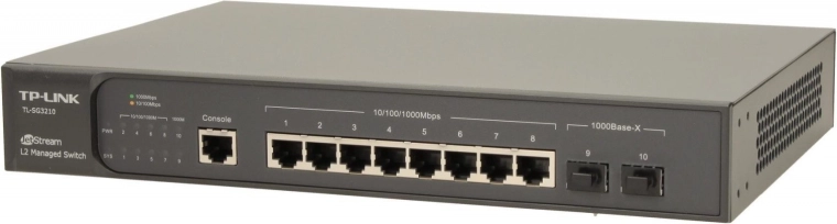 TP-Link TL-SG3210 este un comutator performant cu 8 porturi gigabit RJ45 și 2 sloturi gigabit SFP, ideal pentru conexiuni de rețea stabile și rapide.