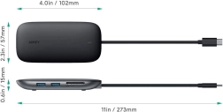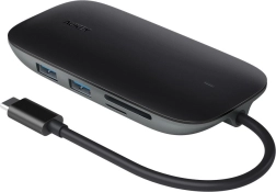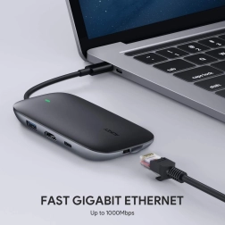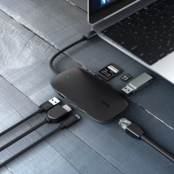Hubul USB-C Aukey CB-C71 este de fapt un hub 8‑în‑1. Este suficient să îl conectați la un singur port USB și veți obține până la OPT intrări, esențiale pentru munca de zi cu zi. Este echipat cu trei porturi USB 3.0, USB-C Power Delivery, port HDMI, port Ethernet și două sloturi pentru carduri. Nu veți mai rămâne fără porturi USB libere; de acum înainte veți putea conecta toate dispozitivele de care aveți nevoie și chiar mai multe.