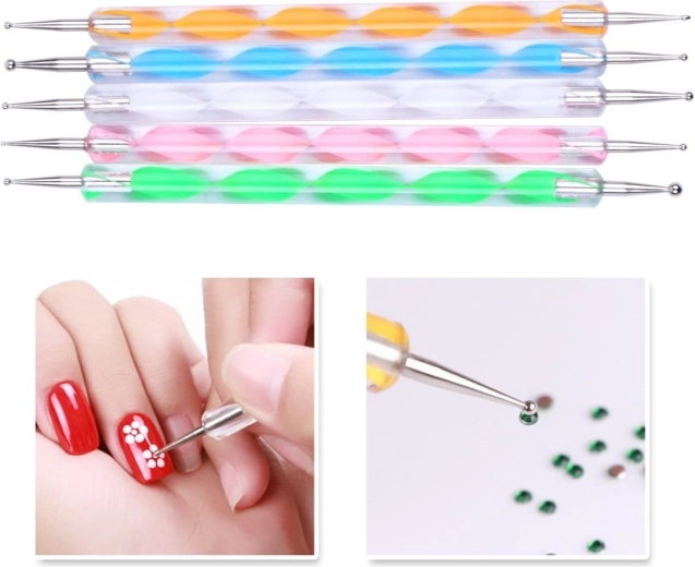 Vă prezentăm setul de 5 sonde duble pentru decorarea unghiilor, un ajutor ideal pentru decorarea unghiilor atât în salon, cât și acasă. Fiecare sondă are vârfuri metalice de dimensiuni diferite, ceea ce facilitează aplicarea ornamentelelor precum paiete și pietricele.
