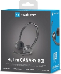 Căști cu logo-ul 'Natec' vizibil pe cupe. Oferă o bandă ajustabilă pentru cap pentru o potrivire excelentă.