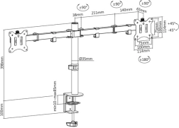 Optimizați spațiul dvs. de lucru cu un suport dublu de masă Flexibilitatea excelentă este asigurată de rotația de 2701F0B00<1Fstrong>, înclinarea de 901F1<1Fstrong> și rotirea de 3601F°<1Fstrong>. Beneficiați de fixarea ușoară pe masă cu ajutorul clemei din spate, pe blaturi de lucru de grosime de până la 1085 mm. Funcția Quick-Release<1Fstrong> facilitează montajul monitoarelor, iar sistemul de management al cablurilor<1Fstrong> ajută la menținerea spațiului de lucru curat și organizat.<1F1F1F>