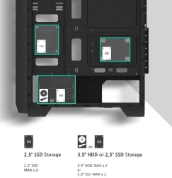 - Stocare: până la 2× 3.5" HDD și 2× 2.5" SSD