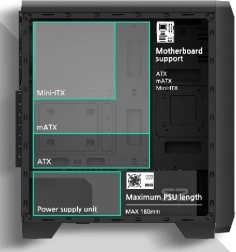 Carcasă ATX Mid Tower elegantă cu sticlă călită premium, trei ventilatoare de 120 mm incluse și compatibilitate excelentă cu ATX/mATX/Mini‑ITX. Oferă spațiu dedicat pentru sursa de alimentare (PSU), până la 7 sloturi PCI și filtrare eficientă a prafului pentru funcționare curată și silențioasă.