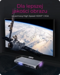 Conectează un monitor prin HDMI la rezoluție de până la 4K@30 Hz sau prin VGA la până la 1080p@60 Hz. Ideal pentru prezentări și ecran extins.