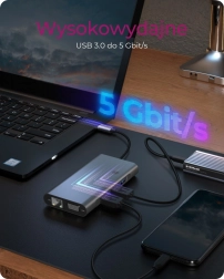 Portul USB‑C cu suport Power Delivery 3.0 asigură alimentare pentru laptop până la 100 W (fără transfer de date), astfel încât este suficient un singur cablu. Nu lipsesc cititoarele SD și microSD pentru backup rapid din camere foto și jack-ul combo de 3,5 mm pentru căști sau microfon. Carcasa durabilă din aluminiu disipează eficient căldura și arată elegant.