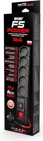 Prelungitorul Acar F5 POWER este soluția ideală pentru utilizarea în birou sau acasă. Cu o lungime compactă de 33 cm și cinci prize cu împământare, oferă suficiente opțiuni de conectare pentru majoritatea dispozitivelor electrice. Comutatorul întărit este rezistent la curenții de pornire care apar în mod obișnuit atunci când se pornesc sursele de alimentare ale PC-urilor desktop și laptopurilor. Include și un indicator pentru funcționarea corectă a sistemului de protecție împotriva supratensiunii, care protejează toate liniile de alimentare și conduce energia la împământare prin intermediul conductorului de protecție PE.