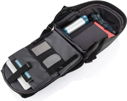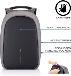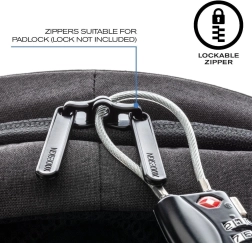 Rucsacul se deschide doar din partea din spate, ceea ce îngreunează accesul hoților. Buzunarele și fermoarele ascunse oferă protecție suplimentară.
