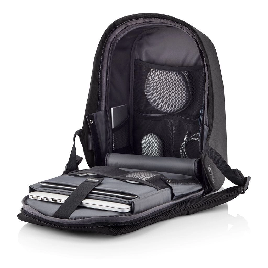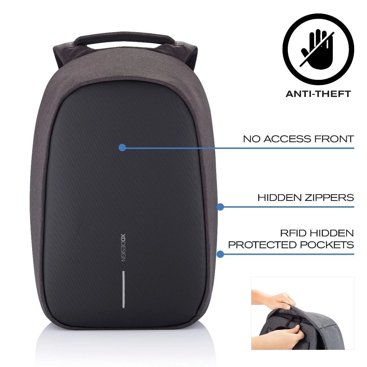 Rucsacul este proiectat cu o carcasă dură și fermoare sigure. Pe partea din față se află vizibilul logo XD Design. Fermoarele ascunse și materialul rezistent la tăiere protejează valorile, ideal pentru naveta zilnică și călătorii.