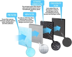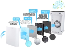 Captează până la 99,97% alergeni, polen și praf datorită filtrului în 4 trepte: prefiltru, filtru cu carbon activ, filtru HEPA H11 și filtru catalitic rece.