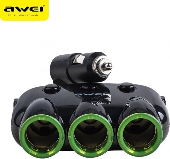 Awei C-3S este un adaptor auto compact care transformă bricheta dvs. de 12–24V într-un hub universal de alimentare. Trei prize pentru brichetă auto, completate de două porturi USB, permit alimentarea și încărcarea a până la cinci dispozitive simultan – de la navigație și cameră auto la telefon sau tabletă.