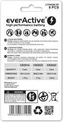 Setul de baterii cu litiu everActive conține 4 x CR2032, 2 x CR2025 și 2 x CR2016. Ideal pentru utilizarea largă în diverse dispozitive.