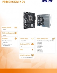ASUS PRIME H610M-K D4 este proiectată pentru fiabilitate și stabilitate zilnică. Suportă procesoare Intel Core din generațiile 12 și 13 pe socket LGA 1700 și utilizează memoria DDR4 consacrată, permițând construirea facilă a unui PC performant și eficient pentru muncă, studiu și multimedia.