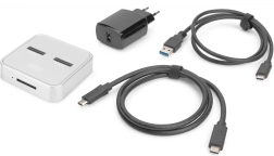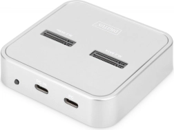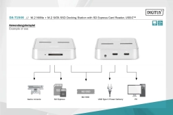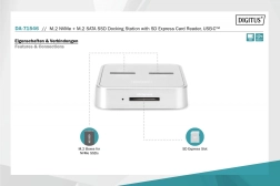 Stația de andocare universală DIGITUS combină două sloturi independente pentru SSD M.2 – unul pentru NVMe (B+M Key / M‑Key) și altul pentru SATA (B+M Key) – împreună cu un cititor SD Express 7.1. Obțineți astfel un centru flexibil pentru gestionarea și migrarea datelor, cu suport pentru unități de până la 4 TB per slot și carduri SD de până la 2 TB.