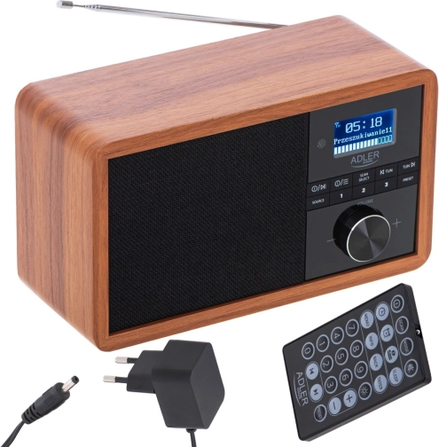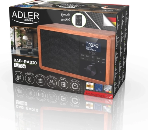 În era dezvoltării tehnologiei, ne așteptăm la soluții noi și în cazul radioreceptoarelor. Fie că suntem acasă sau la serviciu, ne place să avem la dispoziție muzică sau emisiuni radio preferate pentru a ne face timpul mai plăcut. Utilizarea tehnologiei Bluetooth în radioul AD 1184 permite conectarea wireless la dispozitivul de pe care redați muzica, fie că este vorba despre smartphone, tabletă sau computer. Designul elegant și carcasa din lemn permit ca radioul să se potrivească în orice interior. Radioul recepționează emisiuni în benzile FM, AM și DAB+. Aparatul este echipat cu un ecran LCD ușor de citit. Radioul are ceas încorporat și funcție de alarmă. Radioul ne permite să ascultăm emisiunile preferate în benzile FM, AM, dar și DAB+. Este o combinație foarte utilă de mai multe funcții. Difuzoarele cu putere de 3 W oferă un sunet clar și limpede. Iar memoria pentru posturi permite salvarea comodă a stațiilor preferate și ascultate cel mai des. Ecranul LCD permite controlul facil al funcționării aparatului și este un accent interesant în carcasa din lemn.