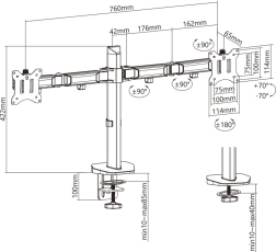Instalarea este flexibilă – alege fixarea cu clemă pe muchia biroului sau montajul prin orificiul pentru cabluri. Standardele universale VESA 75x75 și 100x100 asigură compatibilitatea cu majoritatea monitoarelor LCD/LED de la 17 la 32 de inci.