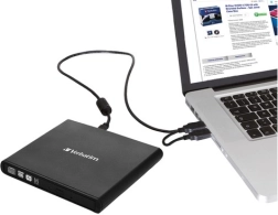 Unitatea externă slim VERBATIM adaugă laptopului tău posibilitatea de a citi și inscripționa CD și DVD la birou, acasă sau în deplasare. Datorită designului subțire, încape ușor în geantă și se conectează cu un singur cablu USB 2.0 – fără alimentare externă.