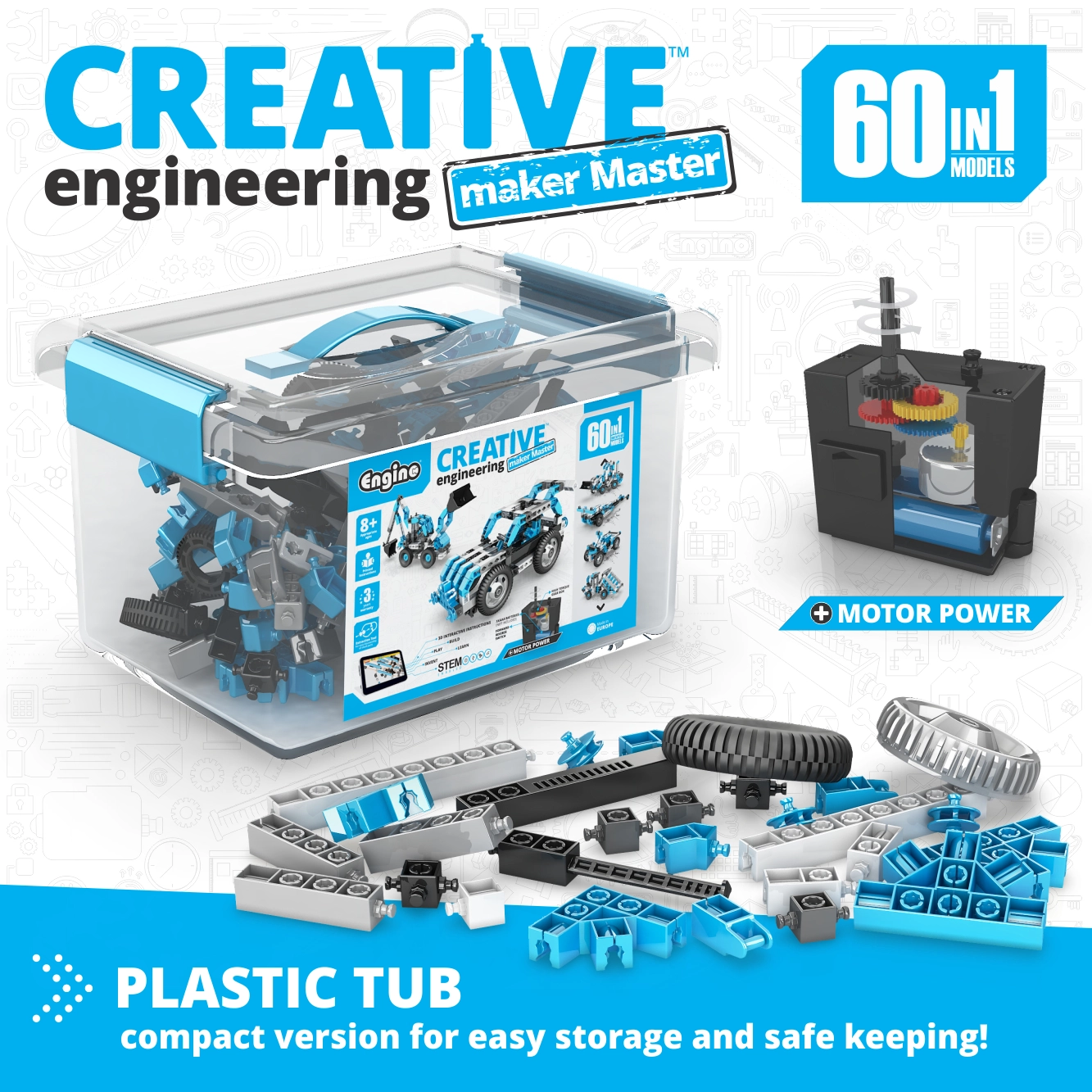 Setul de construcție ENGINO Motorized Maker 60 în 1 este alegerea ideală pentru copiii de la 8 ani în sus, pasionați de tehnică și creație. Instrucțiunile color (o parte tipărite, o parte online sau în aplicația 3D gratuită) te ghidează prin asamblarea zecilor de modele. Piesele se fixează ușor prin clipsare, iar întregul set este depozitat într-o servietă practică din plastic pentru transport și stocare facile.