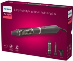 Uscarea și coafarea simultană cu peria cu aer Philips Air Styler Essential permit crearea unor coafuri frumoase și naturale și oferă îngrijire părului. Cele trei accesorii sunt potrivite atât pentru părul lung, cât și pentru cel scurt, astfel încât coafarea este foarte ușoară.
