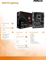 ASRock B650 PG Lightning este o bază fiabilă pentru PC‑uri performante. Platforma AM5 cu suport pentru procesoare AMD Ryzen 7000 și patru sloturi DDR5 permite construirea unui sistem rapid și eficient. Etajul de alimentare de calitate 14+2+1 cu Smart Power Stage și radiatoare masive asigură stabilitate chiar și la sarcini prelungite.