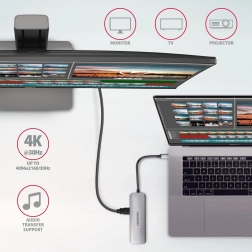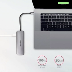 Hub universal 5în1 transformă un singur port USB-C în multiple posibilități. Conectează discuri externe, mouse și tastatură, citește carduri SD/microSD și proiectează simultan imaginea prin HDMI până la 4K/30 Hz. Prin USB-C Power Delivery alimentezi cu ușurință laptopul până la 100 W – economisești astfel un port și un cablu.