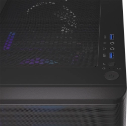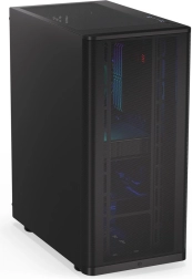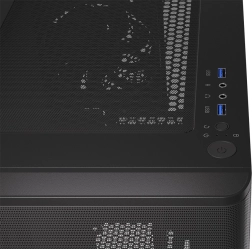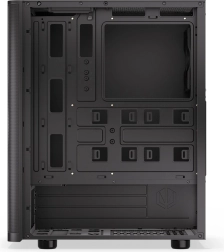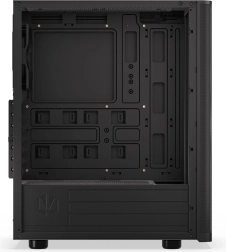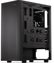 Dimensiuni de 373 × 440 × 211 mm, cu spațiu pentru plăci ATX și stocare: 3× 2,5" sau 1× 3,5" + 2× 2,5". Panoul lateral din oțel protejează componentele și păstrează un aspect elegant.