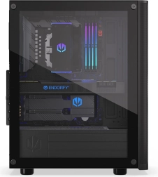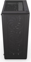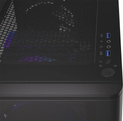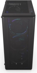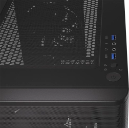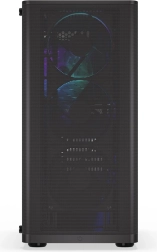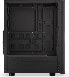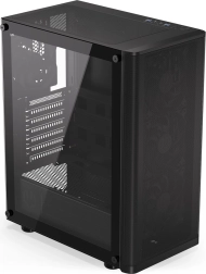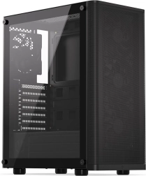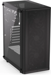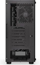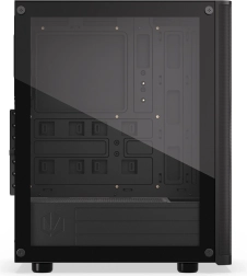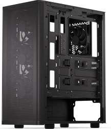 Panoul lateral din sticlă securizată expune elegant componentele, iar construcția solidă a carcasei oferă spațiu pentru configurații performante. Instalezi fără probleme o placă de bază ATX, până la 3× 2,5" unități (sau 1× 3,5" + 2× 2,5") și coolere voluminoase ori bucle de răcire cu apă cu radiatoare de 360 mm (față) și 240 mm (panou superior).