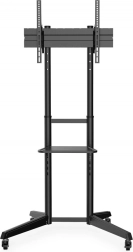 Include un raft practic pentru laptop, player sau set‑top box (40,4 × 25 cm, max. 5 kg). Patru roți de rulare cu blocare asigură mobilitate lină și fixare sigură pe loc. Managementul integrat al cablurilor menține instalația ordonată și profesionistă. Finisajul prin vopsire în câmp electrostatic crește rezistența la uzură.