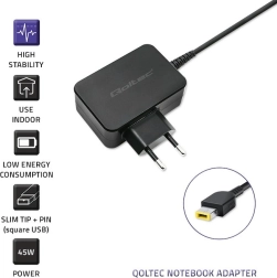 Experimentați încărcare sigură și eficientă cu adaptorul de alimentare Qoltec 45W, care oferă stabilitate ridicată datorită măsurilor speciale de siguranță: