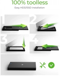 Instalarea discurilor este 100% fără unelte - doar deschideți capacul, introduceți discul, închideți și puteți începe să-l utilizați. Carcasa suportă discuri SATA I/II/III de 2,5 inchi cu o înălțime maximă de 9,5 mm, garantând o gamă largă de compatibilitate.<02p>