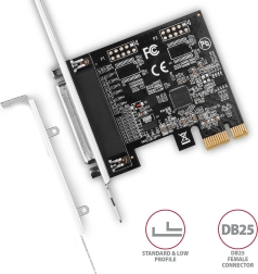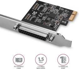 Această placă PCI-Express adaugă PC-ului dvs. un port paralel fiabil pentru conectarea imprimantelor, plotterelor, programatoarelor EPROM, dongle-urilor hardware și altor accesorii industriale. Compatibilitatea fără probleme este asigurată de chipsetul consacrat ASIX AX99100, care suportă modurile SPP/BYTE/ECP și viteză de transfer până la 1,5 MB/s.