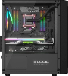 LOGIC ATOS este o carcasă modernă pentru gameri și pentru birou. Panoul frontal aerisit asigură aport optim de aer, iar panoul lateral din sticlă securizată evidențiază elegant componentele și iluminarea ARGB. Controlul iluminării este simplu – este suficient butonul RESET de pe panoul superior.
