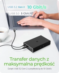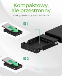 Extindeți capacitatea și simplificați gestionarea datelor cu o carcasă externă din aluminiu pentru două unități SATA de 2,5" SSD/HDD. Dispozitivul suportă patru moduri: RAID 1 pentru protecție maximă, RAID 0 pentru viteză, SINGLE pentru discuri independente și LARGE pentru combinarea capacității. Conexiunea USB 3.2 Gen 2 (10 Gb/s) asigură copiere fulgerătoare și lucru fluent cu proiecte ample.