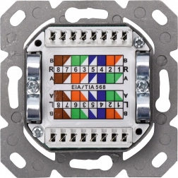 Datorită bornelor LSA cu codare color (EIA/TIA 568 A & B), instalarea este rapidă și fără erori. Priza este compatibilă cu rame standard pentru game de întrerupătoare, permite montaj îngropat și aparent și este potrivită și pentru canale de plintă. Colierul integrat de descărcare a tensiunii protejează cablurile, ieșirea la 40° ușurează conectarea patch-cable-urilor, iar clapetele antipraf prelungesc durata de viață a porturilor.