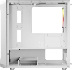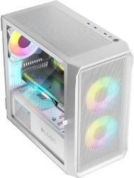 Carcasa este pregătită pentru performanță: găzduiește GPU până la 340 mm, cooler de procesor până la 155 mm și oferă suport pentru răcire cu apă. Datorită filtrelor de praf în partea de jos sub sursă, în partea superioară și la panoul frontal mesh, configurația rămâne mai curată și mai silențioasă. Panoul I/O superior oferă USB 3.0, două USB 2.0, conector audio combo de 3,5 mm, buton Power și buton pentru controlul iluminării ARGB.