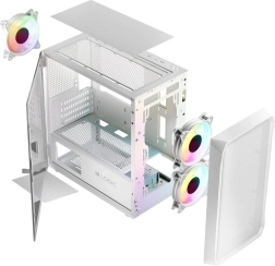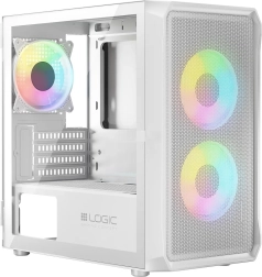LOGIC Portos ARGB Mini este o carcasă pentru gaming stilată și bine gândită, care economisește spațiu pe birou și oferă simultan un flux de aer de top și întreținere facilă. Panoul lateral din sticlă securizată pe balamale funcționează ca o ușă – o deschideți pur și simplu și curățați interiorul cu aer comprimat. Două ventilatoare frontale și unul posterior ARGB de 120 mm răcesc eficient componentele, în timp ce panourile frontal și superior perforate asigură o ventilație excelentă.