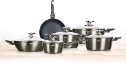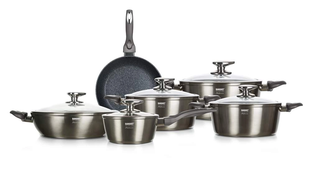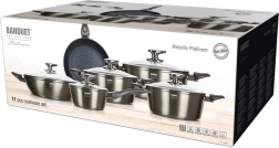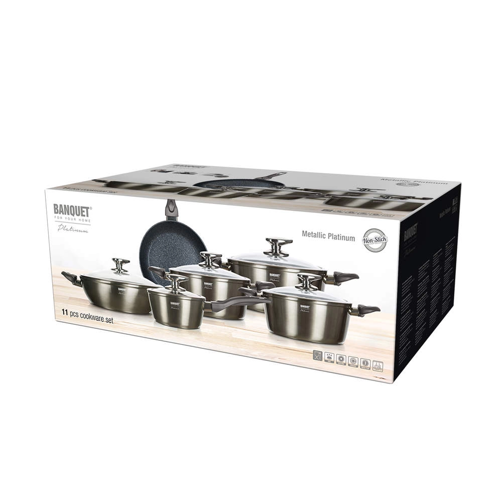 Set din turnări de aluminiu METALLIC PLATINUM, 11 piese. Conține: cratiță cu capac din sticlă 16 cm, oală cu capac din sticlă 16 cm, a doua oală cu capac din sticlă 16 cm, a treia oală cu capac din sticlă 16 cm, oală 20 cm, 2,2 l, oală 24 cm, 4,2 l, oală 28 cm, 6,7 l, cu capace din sticlă și butoane din oțel inoxidabil, oală joasă cu capac din sticlă 28 x 7,5 cm, 3,7 l, tigaie 26 cm, exterior cu finisaj metalic carbon, grosimea peretelui 3 mm, bază complet inductivă, mâner soft touch. Suprafața antiaderentă este foarte dură și rezistentă la zgârieturi. Produsele sunt rezistente la șocuri și deformare. Conductivitatea termică ridicată asigură gătire rapidă și economică – păstrează temperatura mult timp.