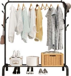 Acest cuier independent pentru rochii și paltoane oferă spațiu generos pentru agățarea hainelor și, în același timp, un raft practic pentru depozitarea încălțămintei, cutiilor sau coșurilor. Cadrul robust din țevi de oțel cu finisaj negru asigură o durată de viață lungă și un design minimalist elegant, potrivit pentru orice interior.