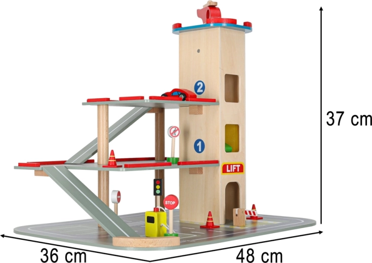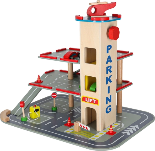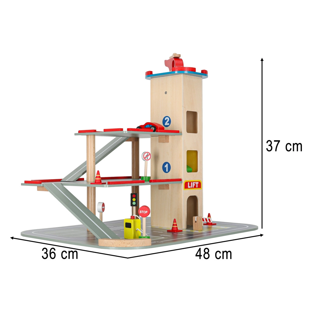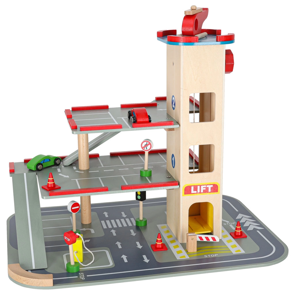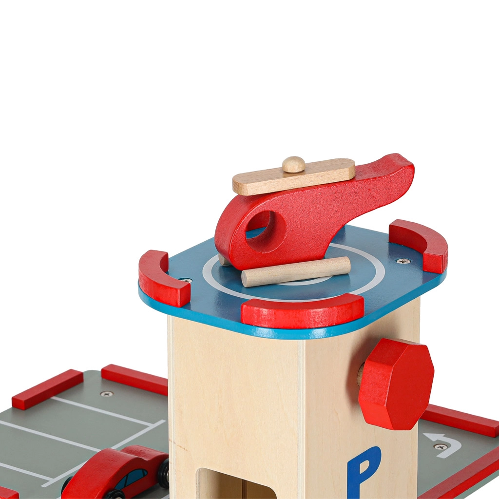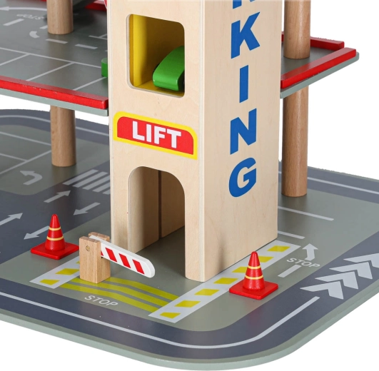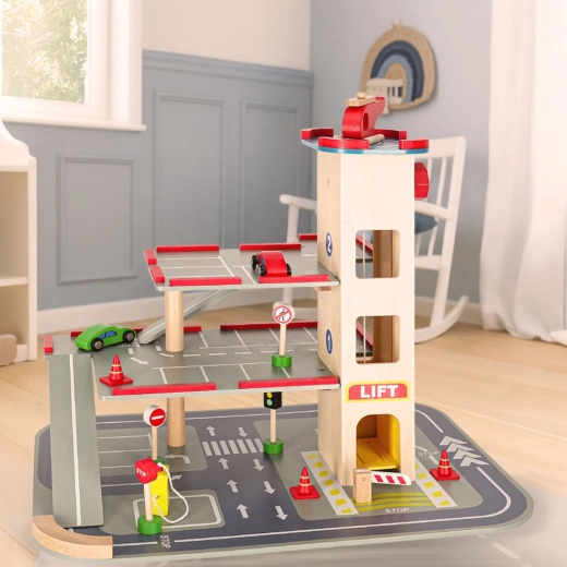 Acest garaj din lemn de calitate oferă până la 4 niveluri de distracție: trei etaje pentru parcare și heliport pe acoperiș. Datorită liftului acționat manual, copiii mută ușor mașinuțele între etaje și pot folosi și rampele fluide. Setul este ideal pentru dezvoltarea motricității fine, a imaginației și pentru învățarea regulilor de circulație.