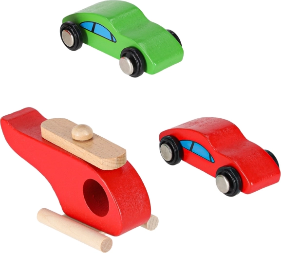 Pachetul include accesorii bogate: 2 mașinuțe din lemn cu roți care se rotesc liber, elicopter cu elice rotativă, 4 indicatoare rutiere, 3 conuri și pompă de combustibil. Toate piesele sunt fabricate din lemn fin șlefuit și vopsite cu vopsele netoxice pentru un joc în siguranță.
