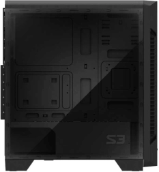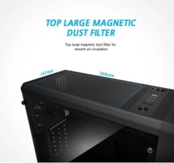 Carcasa este echipată cu sticlă temperată fără ramă cu grosime de 4 mm, oferind o vedere panoramică asupra sistemului intern. Acest design elegant este completat de un spațiu dedicat pentru sursa de alimentare și filtre de praf, care asigură curățenia și un flux eficient de aer.
