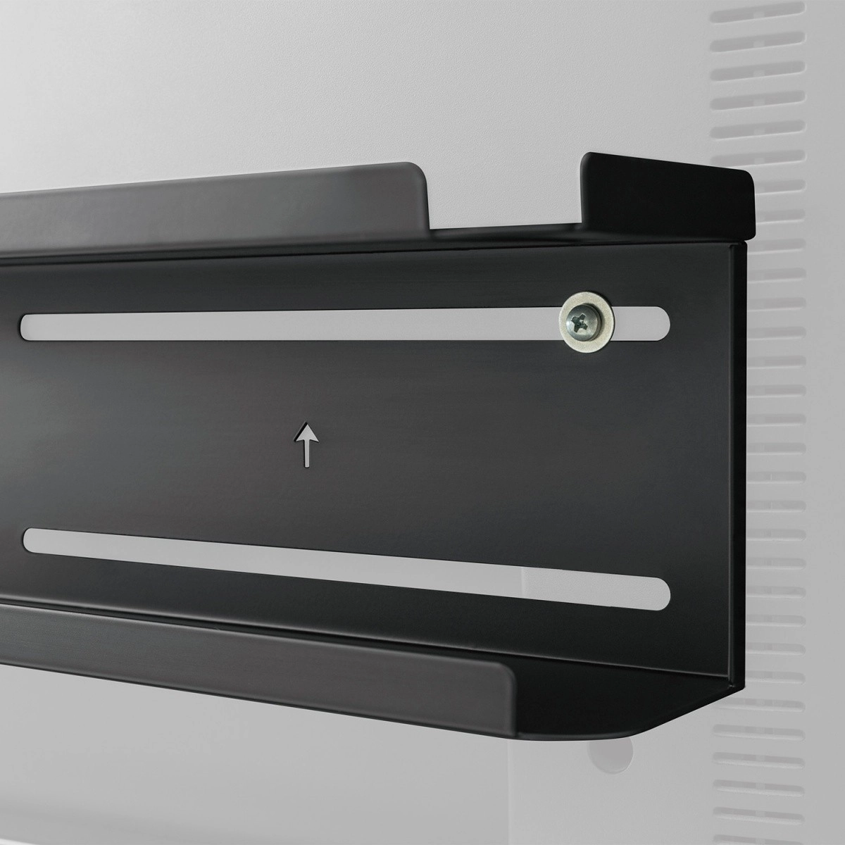 Raft 2 în 1 cu două opțiuni de montare: pe perete sau pe partea din spate a televizorului. Raftul este format din două polițe – pe polița superioară se află, în plus, un covoraș antiderapant care protejează și mai bine obiectele depozitate pe ea împotriva căderii. Designul universal se adaptează ușor oricărui mediu. Cu acest raft de depozitare, spațiul din jurul televizorului poate fi organizat mai ușor. Suprafața mare oferă suficient loc, printre altele, pentru router, telecomanda televizorului, prelungitor și alte obiecte. Încărcarea maximă a raftului este de 2 kg.
