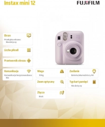 FUJIFILM Instax Mini 12 este o alegere excelentă pentru toți cei care vor amintiri pe hârtie, pe loc. Datorită operării simple și printării instant fiabile, este ideal atât pentru începători, cât și pentru pasionații creativi. Finisajul pastelat stilat, în nuanța mov, îți subliniază stilul personal.