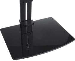 Polița integrată din sticlă poate găzdui player Blu‑ray, set‑top box, consolă de jocuri sau tabletă și ajută la menținerea cablurilor și accesoriilor organizate într-un singur loc.