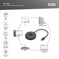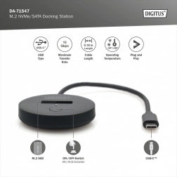 Stația de andocare DIGITUS permite gestionarea și extinderea stocării cu SSD M.2 standard NVMe (B+M Key / M-Key) și SATA (B+M Key). Datorită interfeței USB‑C 3.2 Gen2 atinge viteze de până la 10 Gbps, astfel încât transferul fișierelor mari, backupul și lucrul cu multimedia sunt rapide și fluide.
