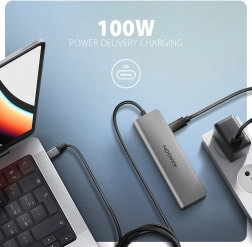- USB‑C Power Delivery 3.0 până la 100 W (doar alimentare); alimentarea laptopului prin hub; PD trebuie să fie suportat atât de laptop/telefon, cât și de încărcător