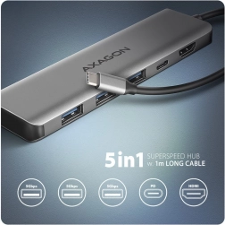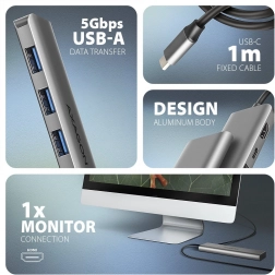 Hubul USB‑C compact 5‑în‑1 îți extinde laptopul cu cinci porturi: 3× USB‑A 5 Gbps pentru date rapide și încărcare, HDMI până la 4K/30 Hz pentru conectarea unui monitor și USB‑C Power Delivery până la 100 W pentru alimentarea continuă a laptopului. Datorită cabului USB‑C de 1 m, poți poziționa hubul exact acolo unde ai nevoie. Carcasa din aluminiu asigură durabilitate și răcire pasivă, iar suportul Plug & Play și Hot Plug face conectarea extrem de ușoară.