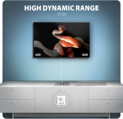 - HDR (10‑bit), Hot‑Plug‑Detect, TMDS, HDCP 1.4/2.3; audio pe 2 canale până la 48 kHz/24‑bit în funcție de sursă/dispozitivul final